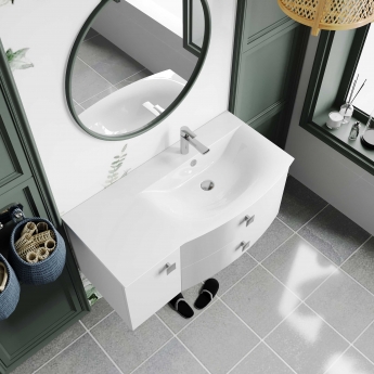 - Luxurious curved-front vanity unit design providing functional storage and eye-catching aesthetics
