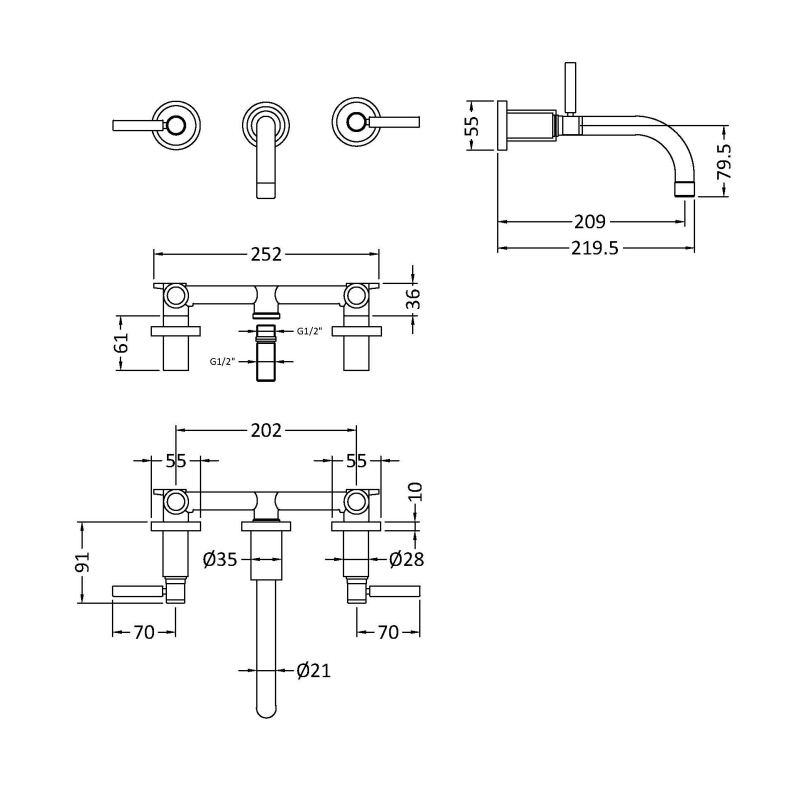 Hudson Reed Tec Lever 3-Hole Basin Mixer Tap Wall Mounted - Chrome | Thumbnail Image Hudson Reed Tec Lever 3-Hole Basin Mixer Tap Wall Mounted - Chrome