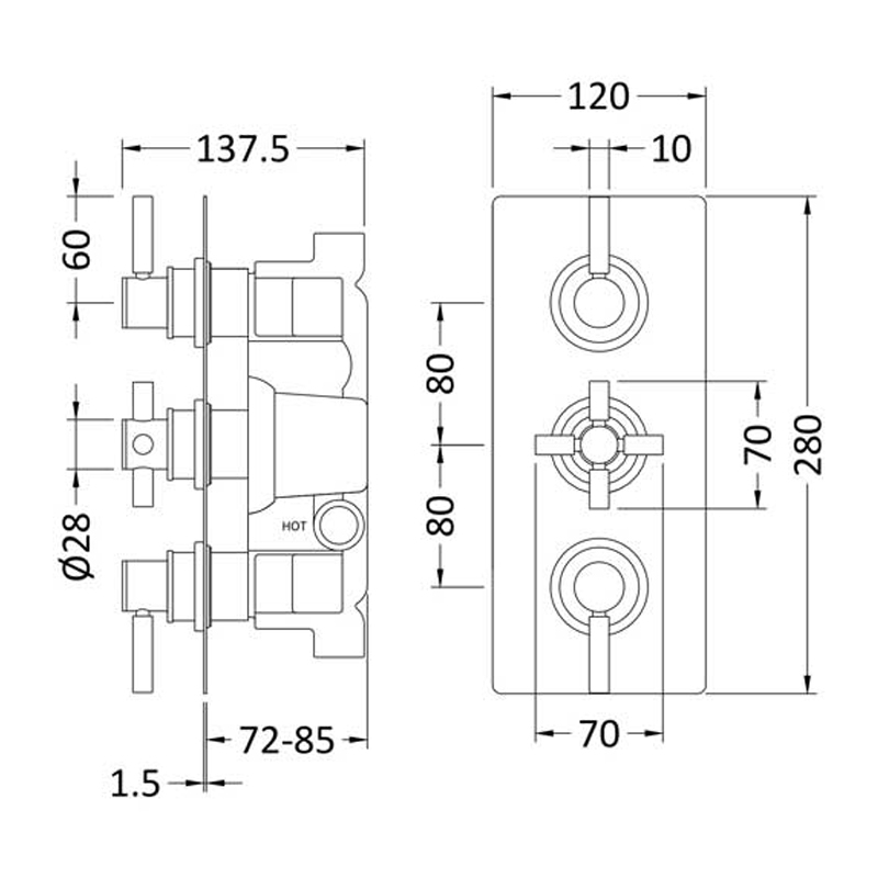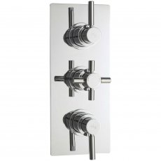 - Top control operates two shower outlets, centre adjusts temperature, bottom control operates the other shower outlet