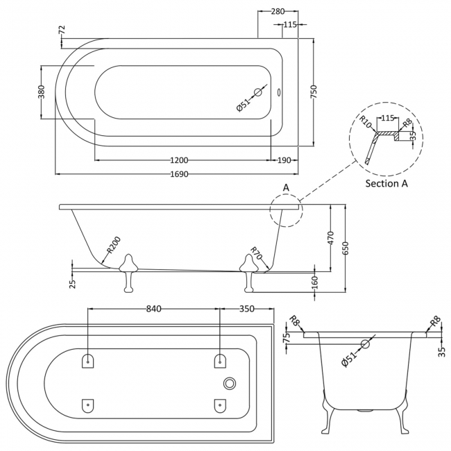 • Bath supplied with Deacon leg set