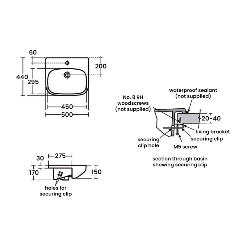 • Basin designed to work with short projection furniture to a minimum of 210mm projection allowing 10mm gap at rear to tile down onto worktop