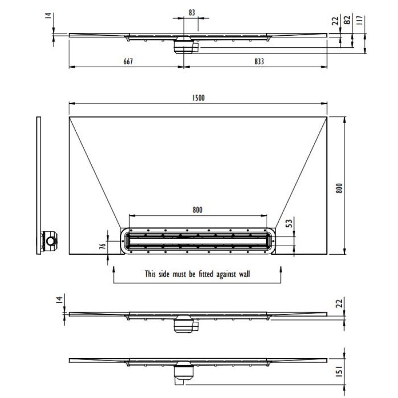 The Aqua-Dec Linear 3 is a level access floor former designed for tiled wet rooms. The Linear 3 model consists of 3 separate gradients built in to the tray - at the front, and each side of the thin 800mm drain. This layout makes the tray a great solution for walk-through enclosures. Unlike other Aqua-Dec Linear models, this tray can also be trimmed to within 75mm of the drain.