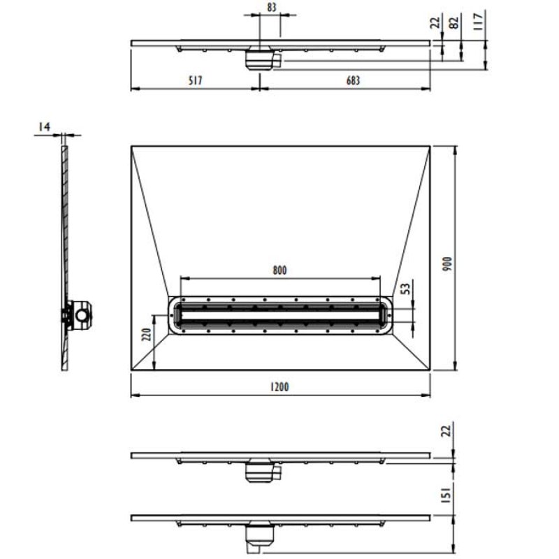 - 4 gradients (falls) built in to the tray, leading to the linear drain