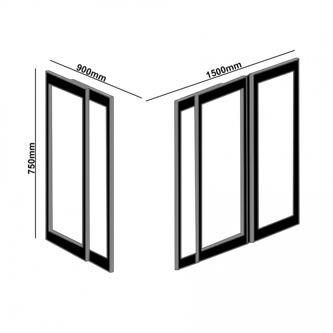 • Fixed 400mm half height panel, floor to ceiling pole with pair of sliders meeting a return pair of sliders on the corner