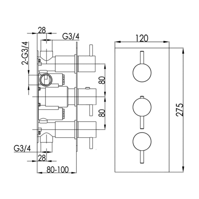 JTP Florence Concealed Shower Valve with 2-Way Diverter Triple Handle - Chrome