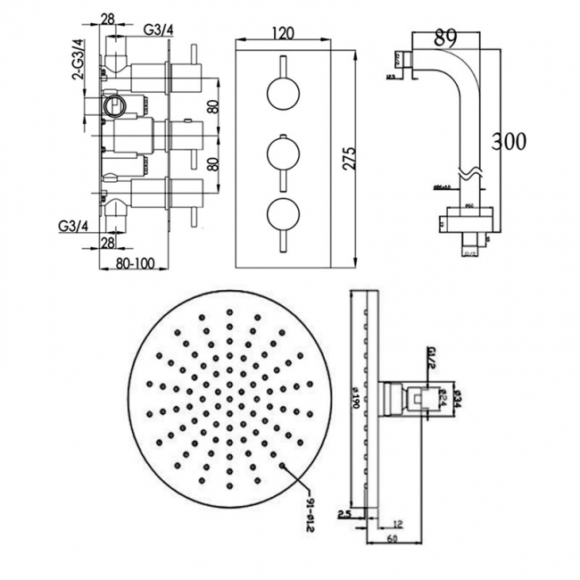 JTP Florence Triple Concealed Mixer Shower with Shower Handset + Fixed Head