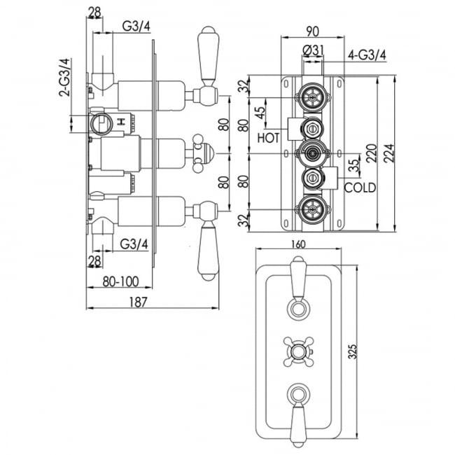 JTP Grosvenor Lever Thermostatic Concealed 2 Outlets Shower Valve - Chrome