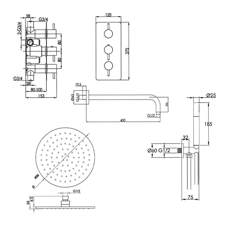 • Comes complete with thermostatic concealed valve with 2 outlets, shower arm with shower head, round water outlet with holder plastic hose and slim hand shower