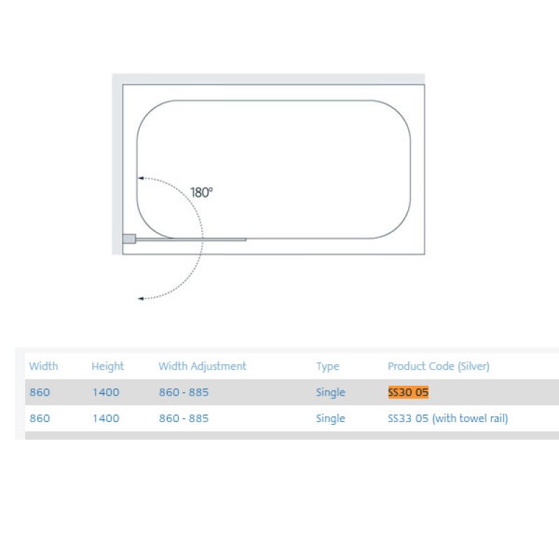 Signature Classic Single Panel Sculpted Hinged Bath Screen with Towel Bar 1400mm H x 860mm W - 6mm Glass | Product Image Signature Classic Single Panel Sculpted Hinged Bath Screen with Towel Bar 1400mm H x 860mm W - 6mm Glass