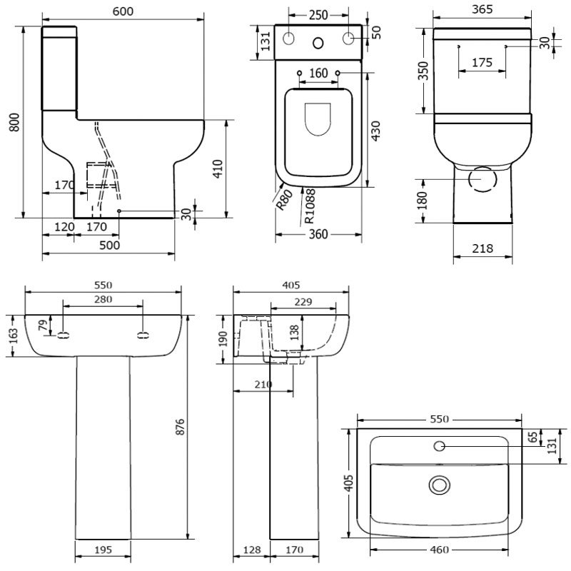 RAK Metropolitan Bathroom Suite Close Coupled Toilet and Basin 520mm Wide - 2 Tap Hole