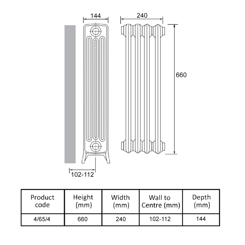 • The images showing the radiator in a room depict a 4-column model measuring 660mm x 800mm (13 sections)
