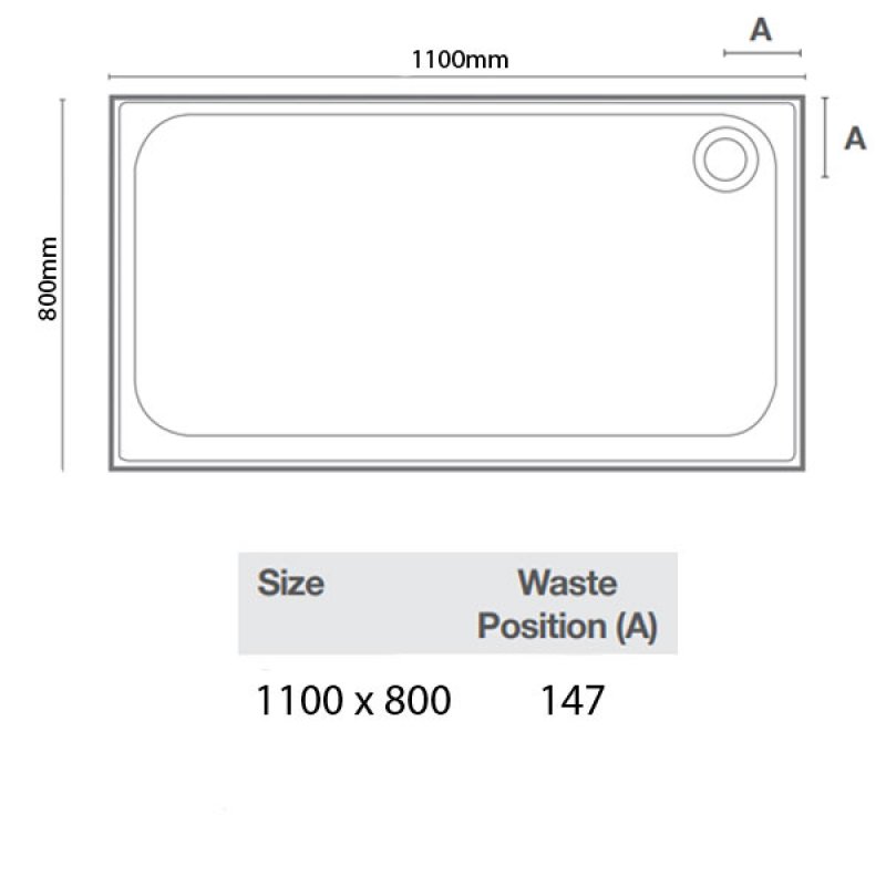- Corner waste hole position on all tray sizes under 1700mm