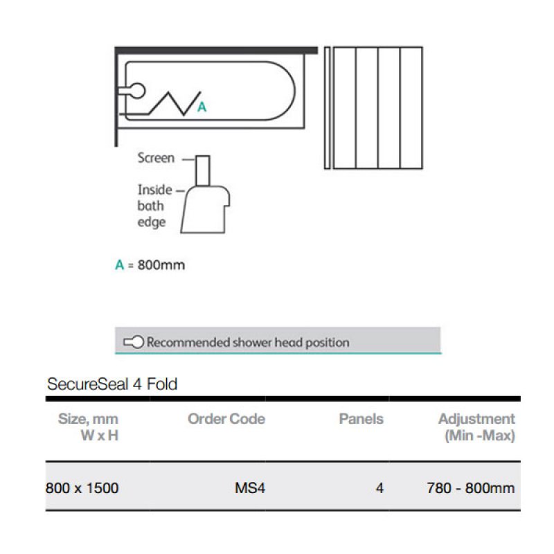 The Merlyn SecureSeal Four Folding Bath Screen 1500mm H x 800mm W - 6mm Glass is a model from the SecureSeal range of Shower Bath Screen part of the Merlyn bathroom collection. The SecureSeal by Merlyn 4 Fold offers a functional and easy to use design, The leak free sealing arm extends from the profile to create a complete seal between the bath and screen, allowing you to enjoy peace of mind in a leak free shower experience. When not in use, the arm simply folds away back into the profile. Combining style with practical functionality the bath screen with glass heights of 1500mm and 6mm glass, functional and easy to use designs,and a Life-time guarantee for peaceof mind.