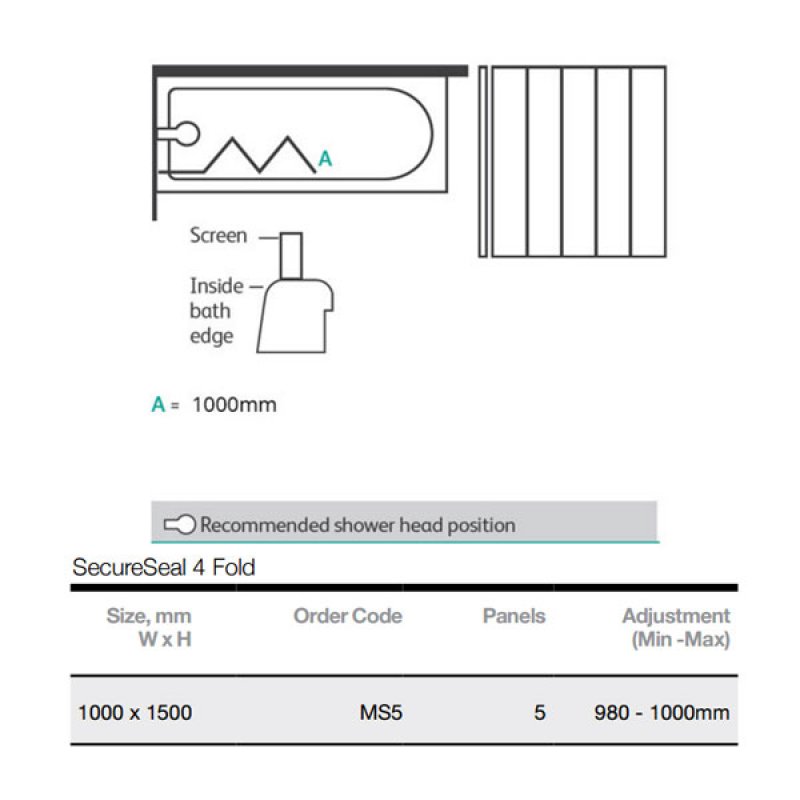 The Merlyn SecureSeal 5 Fold Bath Screen, 1000mm Wide, 6mm Glass is a model from the SecureSeal range of Shower Bath Screen part of the Merlyn bathroom collection. The SecureSeal by Merlyn 5 Fold offers a functional and easy to use design, The leak free sealing arm extends from the profile to create a complete seal between the bath and screen, allowing you to enjoy peace of mind in a leak free shower experience. Combining style with practical functionality the bath screen with glass heights of 1500mm and 6mm glass, functional and easy to use designs,and a Life-time guarantee for peaceof mind.