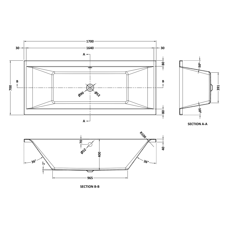 - 1700mm x 700mm rectangular bath with square internal area and 80mm front/back edges