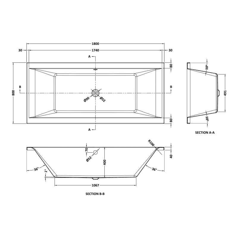 - 1800mm x 800mm rectangular bath with square internal area and 80mm front/back edges