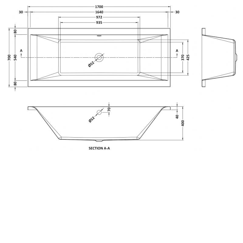 - 1700mm x 700mm rectangular bath with square design and 80mm front and back ledges