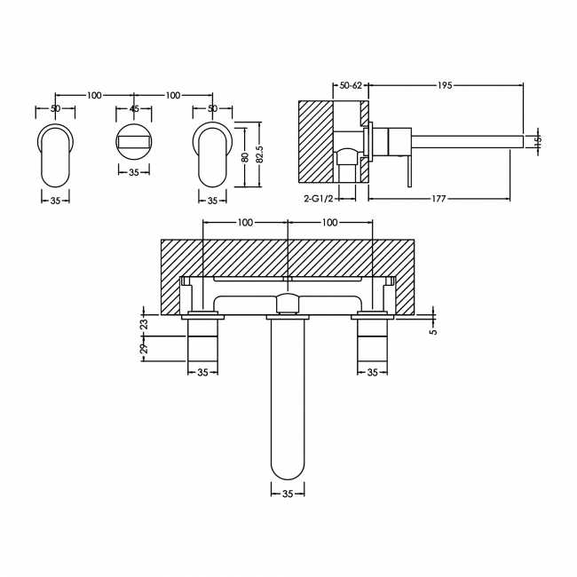 Nuie Binsey 3-Hole Wall Mounted Basin Mixer Tap without Plate - Chrome | Thumbnail Image Nuie Binsey 3-Hole Wall Mounted Basin Mixer Tap without Plate - Chrome