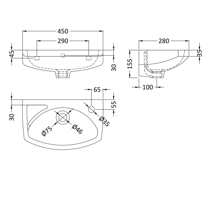 - Rounded cloakroom basin suitable for smaller bathrooms