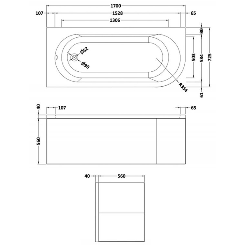 • 1700mm x 725mm x 600mm J-shaped rectangular bath with curved external corner