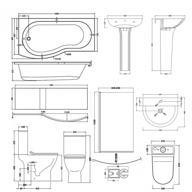 Nuie Freya Complete Bathroom Suite with B-Shaped Shower Bath 1700mm - Left Handed