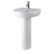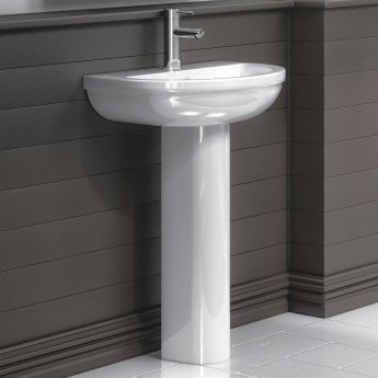 - Basin includes a full, floor-length pedestal for aesthetic appeal to conceal pipework