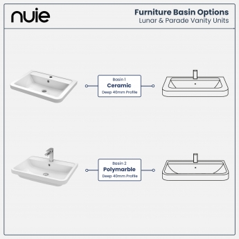 The soft square edges of the Parade cabinet help to set it apart from other units in Nuie's range. The Parade collection is characterised by an understated finger-pull handle that does not dominate the design. 5 attractive colour options, with many upgrades available, including basin options and handle designs that can completely change the look and feel of the unit.