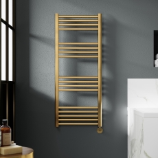 Nuie's brushed brass, round-tube electric ladder rail is certain to give your bathroom a luxurious upgrade aesthetically, all whilst keeping your towels warm at the touch of a button. The rail is supplied pre-filled with an electrical inhibitor solution and fitted with a digital thermostatic element, allowing you total control over the heat without the need for a connection to your central heating system. Available in 2 sizes - 800mm (10 bars) or 1200mm (17 bars).
