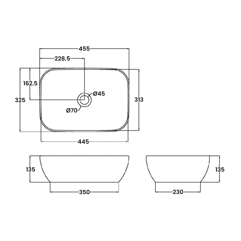• Rectangular basin suitable for mounting on furniture or a counter top