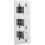 - Top control operates one shower accessory, centre adjusts temperature, bottom control operates the other shower accessory