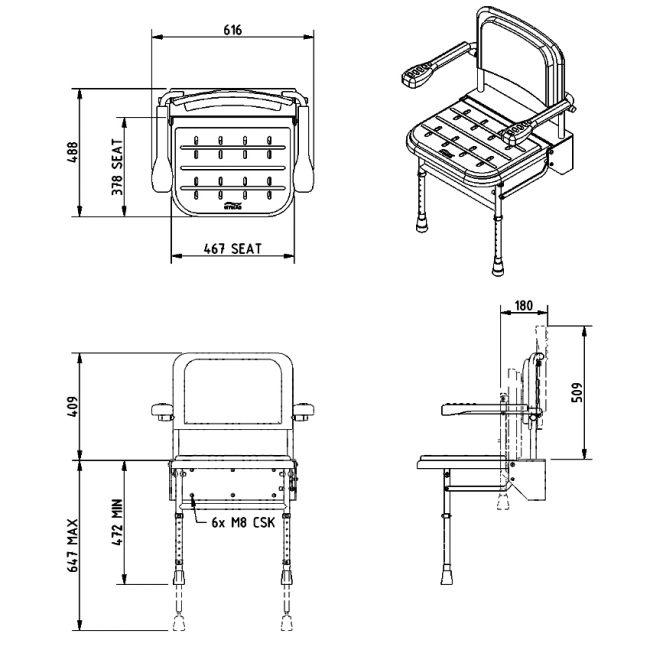 Nymas NymaSTYLE Premium Wall Mounted Padded Shower Seat with Legs Back and Arms - Black