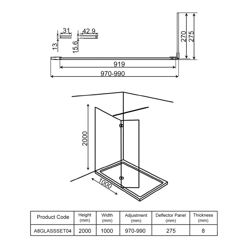 Orbit S8 Wet Room Glass with Deflector Panel (1000mm + 275mm) Wide - 8mm Glass Orbit S8 Wet Room Glass with Deflector Panel (1000mm + 275mm) Wide - 8mm Glass Orbit S8 Wet Room Glass with Deflector Panel (1000mm + 275mm) Wide - 8mm Glass