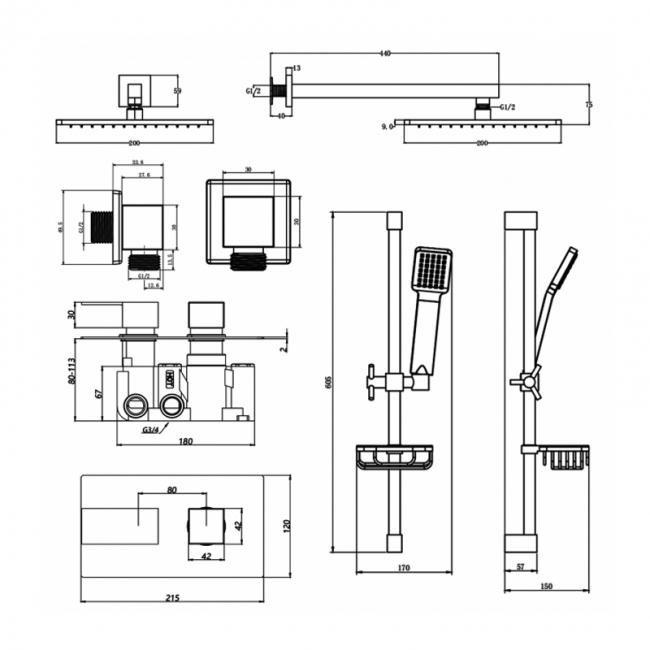 • Supplied complete with Shower valve, Adjustable Slide rail kit, Fixed Shower head and Arm
