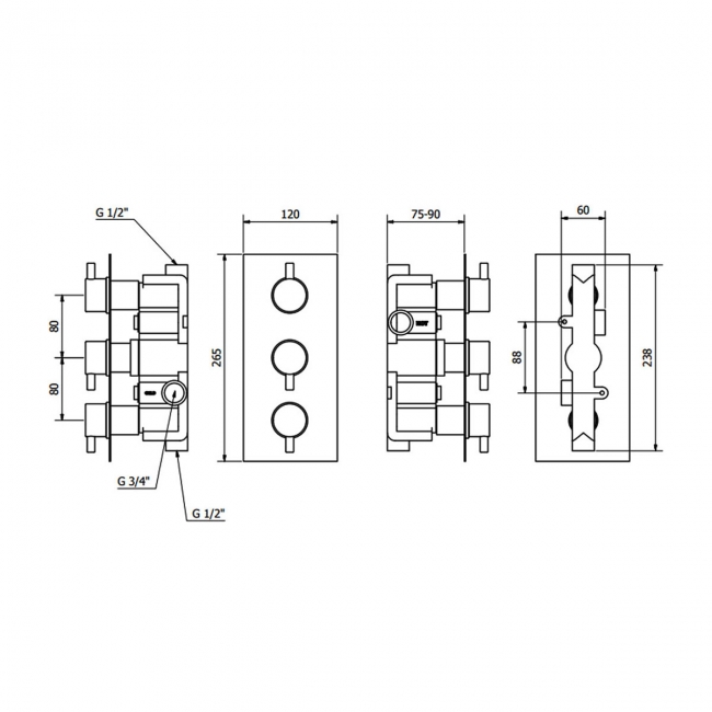 Prestige Plan Thermostatic Concealed Shower Valve Triple Handle - Chrome