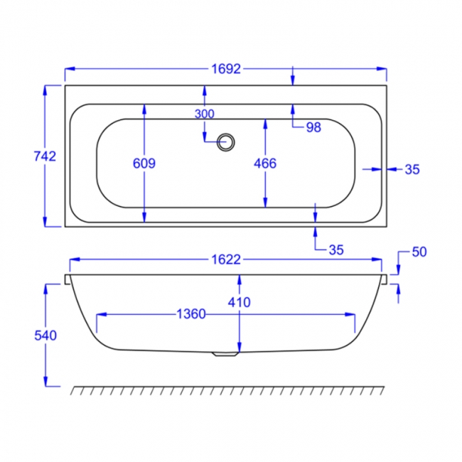 • 1700mm x 750mm rectangular bath with soft square internal corners and thin 35mm edges