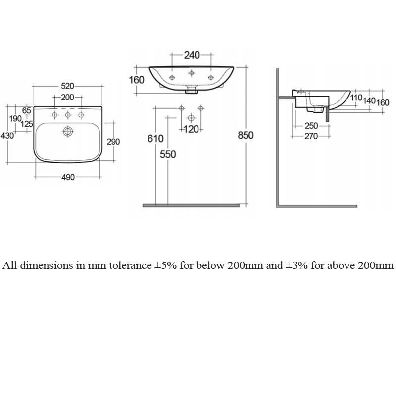 RAK Origin 62 Semi-Recessed Basin 520mm Wide - 1 Tap Hole