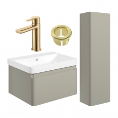 Signature Celeste Bathroom Suite with Wall Hung Vanity Unit and Tall Unit 600mm Wide - Matt Latte/Brushed Brass