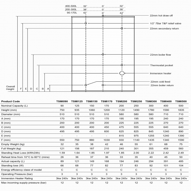 Telford Tempest Indirect Unvented Stainless Steel Hot Water Cylinder 500 Litre