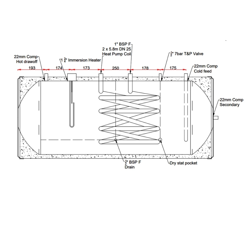Telford Tempest Heat Pump Horizontal Indirect Unvented Stainless Steel Hot Water Cylinder - 250 Litre | Thumbnail Image Telford Tempest Heat Pump Horizontal Indirect Unvented Stainless Steel Hot Water Cylinder - 250 Litre