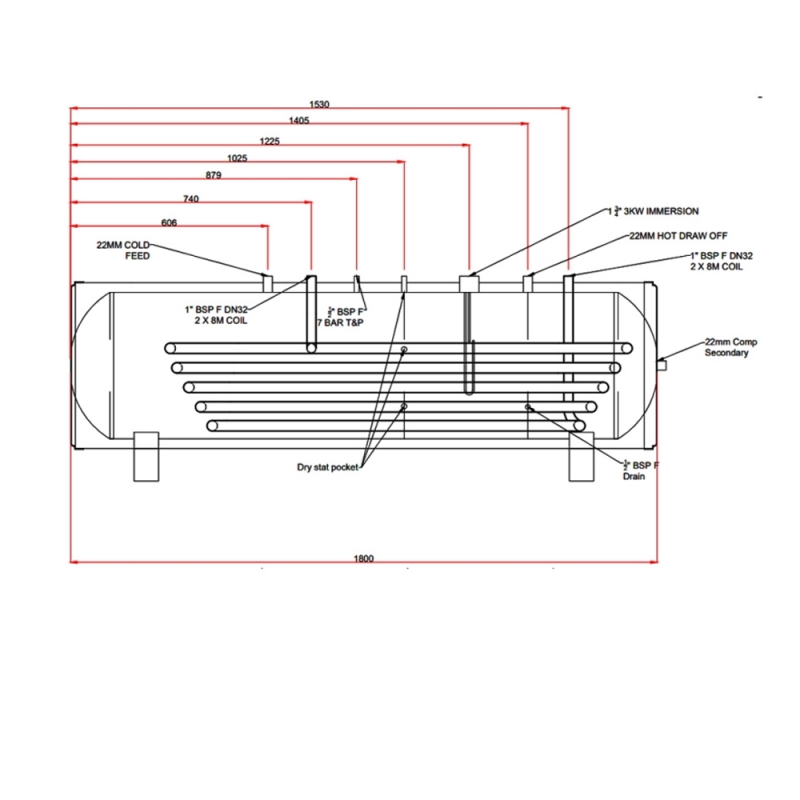 Telford Tempest Heat Pump Horizontal Slimline Indirect Unvented Stainless Steel Hot Water Cylinder - 250 Litre | Thumbnail Image Telford Tempest Heat Pump Horizontal Slimline Indirect Unvented Stainless Steel Hot Water Cylinder - 250 Litre