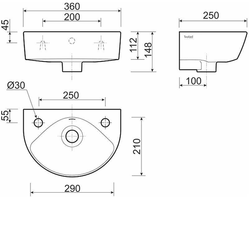 Twyford Alcona Handrinse Wall Hung Basin 360mm Wide - 2 Tap Hole
