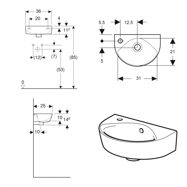 Twyford Alcona Handrinse Wall Hung Basin 360mm Wide Left Handed - 1 Tap Hole