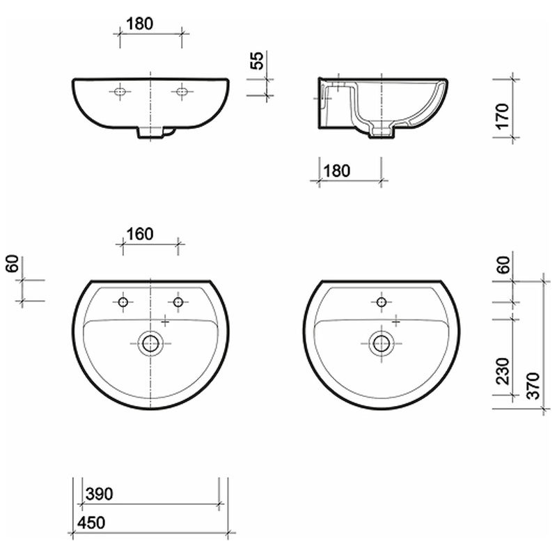 Twyford Alcona Handrinse Wall Hung Basin 450mm Wide - 2 Tap Hole