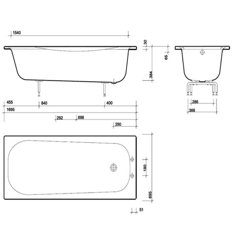 Twyford Neptune Single Ended Rectangular Bath 1700mm x 700mm 2 Tap Hole