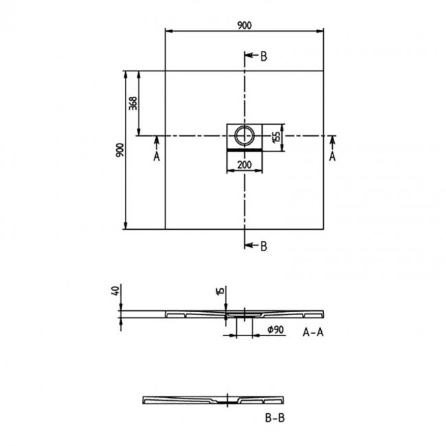 - Ultra-flat, rimless square shower tray measuring 900mm x 900mm