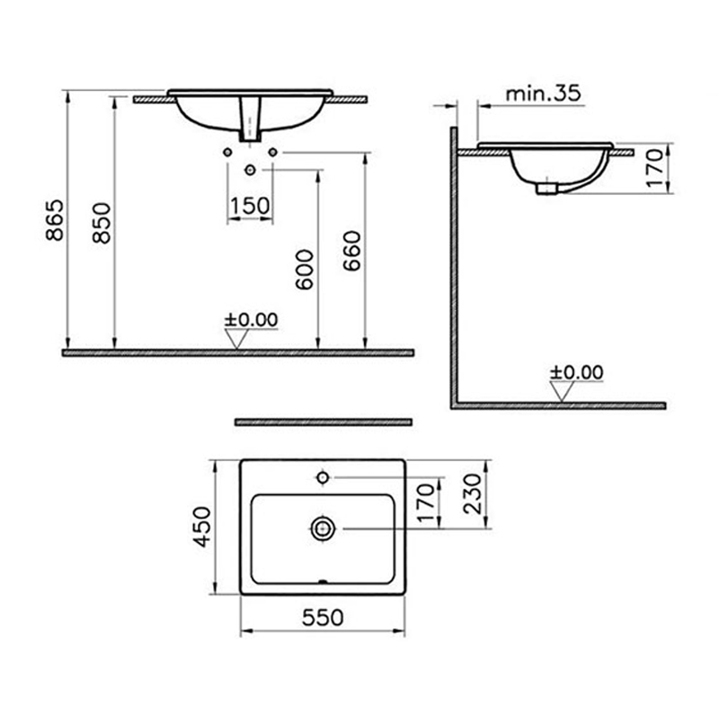 Vitra S20 Compact Countertop inset Basin Front Overflow 550mm Wide - 1 Tap Hole