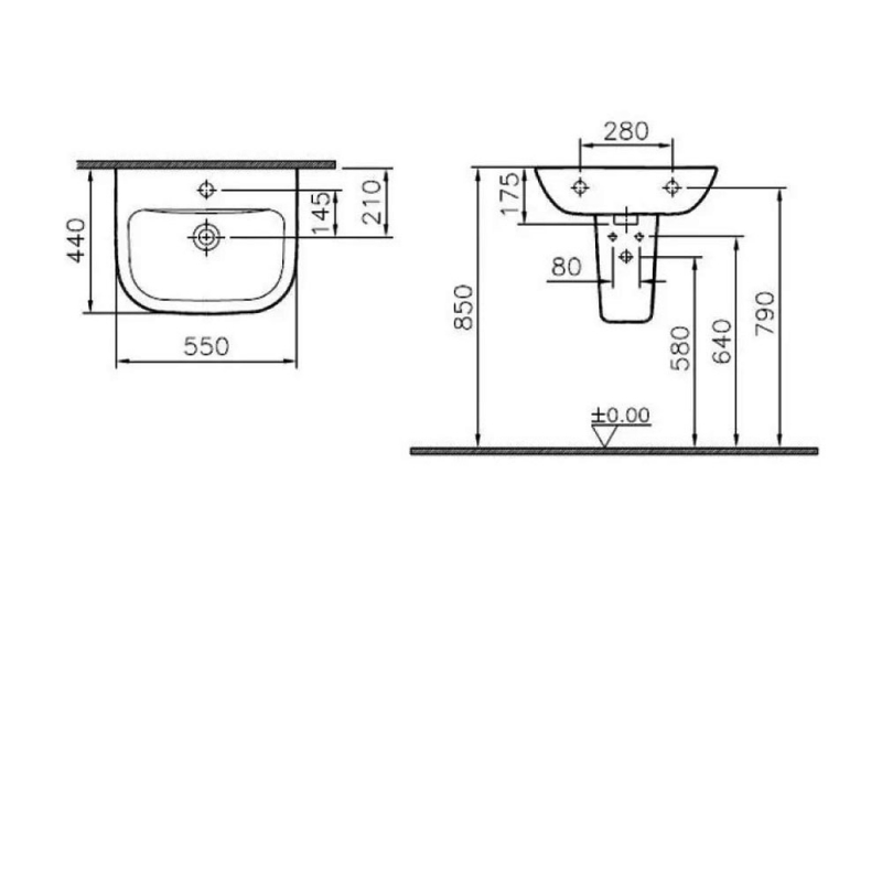 Vitra S20 Wash Basin and Large Semi Pedestal 550mm Wide 2 Tap Hole